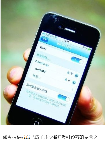 “現在用智能手機、平板電腦的人越來越多,店里有無線網絡,也是給客人提供方便!迸f城一家茶餐廳店長稱,如果無線網不設置密碼,周圍“蹭網”的人會更多,而帶寬是不變的,這樣店里的客人使用無線時速度就會減慢。當然餐廳提供wifi也帶來一些不便。該店長告訴記者,有些蹭網鐵粉經常到餐廳一帶消費,對各家店鋪的wifi密碼熟記于心,有時甚至出現在別家消費蹭隔壁的wifi,造成本店消費者上網速度緩慢,該店長對此表示無奈,“店里也不能為了防止‘蹭網’不斷更換密碼,這樣會對本店消費者造成困擾,更重要的是,飯店提供無線網絡,本身就是增加‘黏性’,希望更多消費者選擇本店就餐!