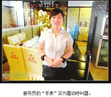 據(jù)大堂經(jīng)理介紹,每個服務(wù)員手腕上,都戴著一個像手表一樣的“服務(wù)呼叫器”,上有加菜、酒水、買單、服務(wù)和取消等功能。當客人有需要時,按清單上的按鈕,其所在餐桌的號數(shù)、所需服務(wù)的種類,就會通過該服務(wù)呼叫器顯示,以震動方式告知服務(wù)員。