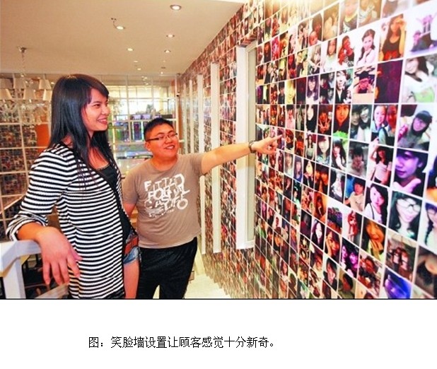 店主鄭鑫龍說,開業(yè)前一個月,他通過微博征集泉州市民的笑臉照。“總共征集到3500張照片,最后我選取了1000張,用特制的墻紙做成笑臉墻。”據(jù)介紹,照片上的人物大多數(shù)是泉州人,其中的主體是1993、1994年出生的美少女,她們的笑容或俏皮,或甜美,或秀氣。此外,還有少部分照片反映是寶寶的可愛表情。一邊看著美少女,一邊用餐,可以勾起人們的食欲,或許老板想營造的就是秀色可餐這一概念。