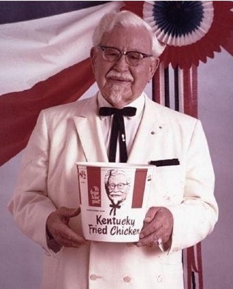 創(chuàng)始人桑德斯上校創(chuàng)辦肯德基時(shí)66歲,靠每月的$105社保生活。在肯德基獲得成功而接受電視臺采訪時(shí),他找出自己唯一一套干凈的、白色棕櫚裝,從此這一打扮成為他獨(dú)特的標(biāo)識造型,并以此注冊商標(biāo)。從此以后,人們便將這套西裝與肯德基聯(lián)想在一起;而他的這身白西裝,滿頭白發(fā),及山羊胡子也成為了全國性的象征。因?yàn)樯庾龅暮茫系禄蓍L于1935年封他為肯德基上校,以表彰他對肯德基州餐飲的貢獻(xiàn)。