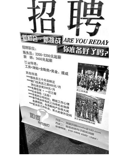 [摘要] 招工方甚至會多于求職方;而洗車行、餐廳則充分利用起自家的門臉,貼出告示公開招聘相應人員,一邊緊巴巴地做生意,一邊眼巴巴等著有人上門來應聘,有些餐館甚至為招聘打出境外游獎勵。