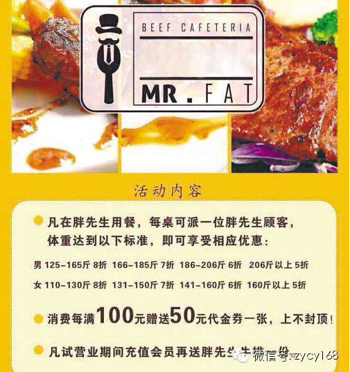 每桌可派一位胖先生顧客,體重達到以上標(biāo)準(zhǔn),即可享受相應(yīng)優(yōu)惠。