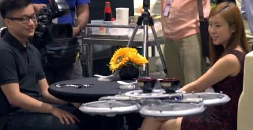 利用無人操控飛行器科技概念,Infinium Robotics公司研發(fā)出“自助無人操控飛行托盤”,服務(wù)生只要預(yù)先輸入桌號后,把食物放在托盤上,托盤就會(huì)自動(dòng)飛行到客人附近。