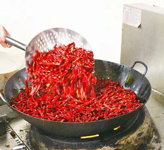 小鍋內加大豆油30斤燒至三成熱,調成中火,下干辣椒15斤炸15分鐘至顏色變深后撈出,此時鍋內油色變紅,繼續下郫縣豆瓣醬30斤,不斷攪動,浸炸15分鐘出香,再下鮮青花椒6斤,翻炒15分鐘后下入泡姜碎40斤繼續浸炸一小時,調入醪糟3斤,約5分鐘后下入香料粉(八角、小茴香、香葉、良姜、排草各0.5斤打成粉),關火后與大鍋料一起倒入不銹鋼桶中混合均勻即可。