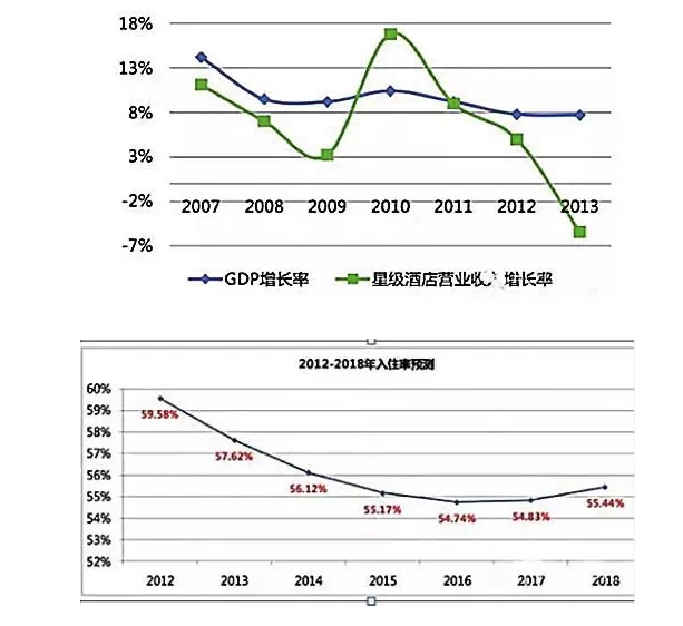 近日,德勤中國合伙人金建在中國飯店全球論壇上透露,預計中國飯店業入住率將持續下跌,直到2017年才有望觸底反彈。此外,從2010-2013年,酒店年度平均資本化率分別為:4.00,3.97,3.11,1.59。這意味著投資高星級酒店的回報年限從25年,一直降到62年。
