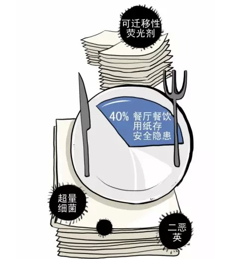 數(shù)據(jù)顯示,85%的消費(fèi)者每周至少在外就餐一次,87.6%的消費(fèi)者會使用餐廳提供的免費(fèi)餐巾紙。由此可見,紙品已成為餐飲企業(yè)消費(fèi)環(huán)節(jié)重要消耗品。然而這些紙張的安全性到底如何?