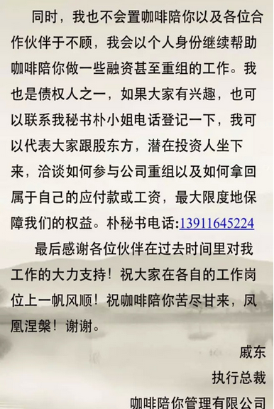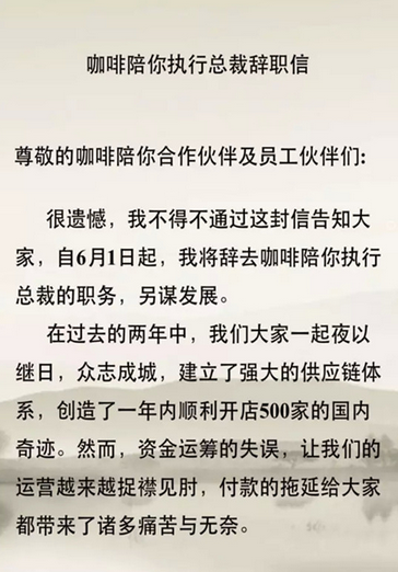 “咖啡陪你”欠2億巨款,執行總裁辭職自曝8個月未領薪水