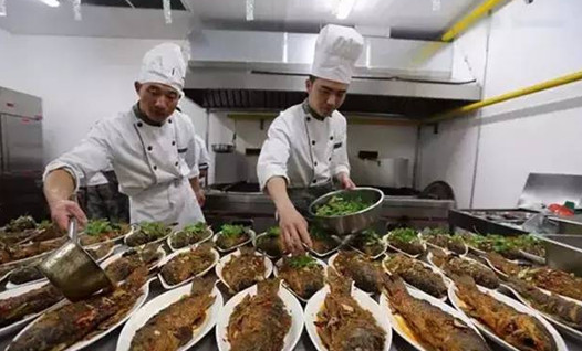 餐廳中,丁司務長正抱著一桶水往餐臺里倒,記者急忙走上去幫忙,原來他是在準備飯菜的保溫工作。5時40分,4道菜已經擺放到加熱好的餐臺上。