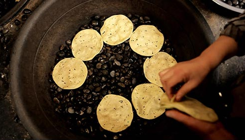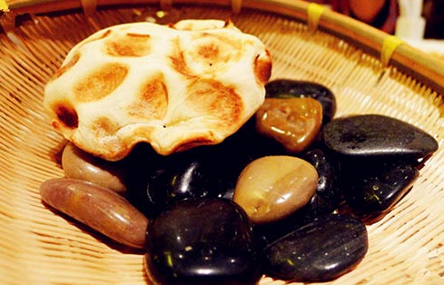 石子饃具有明顯的石器時代“石烹”遺風,唐代亦稱“石鏊餅”因其是將餅坯放在燒熱的石子上烙制故而得名,又稱砂子饃。石子饃其歷史源遠流長,各地都有,晉陜及中原地區(qū)非常流行,石子饃主要原料是面粉、調味料和動植物油,石子饃的餅胚放在一鍋又黑又圓的石子上面,烤出來的面餅外觀焦黃鮮亮,中凹邊突,咬開后層次分明,外酥內(nèi)軟。石烙工藝講究傳熱均勻,火力不能太小或太大。太小則無焦香味,更無酥脆的質感,太大則外焦而內(nèi)不熟,對成品外型也會有很大影響。由于石頭本身是熱的良導體,傳熱均勻迅速,使烹調時間得以有效地縮短。在生產(chǎn)資料極端匱乏的古代,采用石烹技法是個聰明又健康的方法。