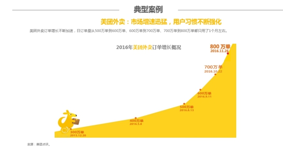 報(bào)告指出,外賣(mài)O2O市場(chǎng)增速迅猛,用戶習(xí)慣不斷強(qiáng)化。以美團(tuán)外賣(mài)為例,通過(guò)美團(tuán)外賣(mài)APP、美團(tuán)、大眾點(diǎn)評(píng)、手機(jī)QQ、微信等多元化的入口引流,截至今年9月,月活躍用戶數(shù)高達(dá)8,018萬(wàn)人。目前,美團(tuán)外賣(mài)的日訂單量更是超過(guò)了800萬(wàn)單,其中,日訂單量從500萬(wàn)單到600萬(wàn)單、600萬(wàn)單到700萬(wàn)單、700萬(wàn)單到800萬(wàn)單的增長(zhǎng)都只用了1個(gè)月左右。