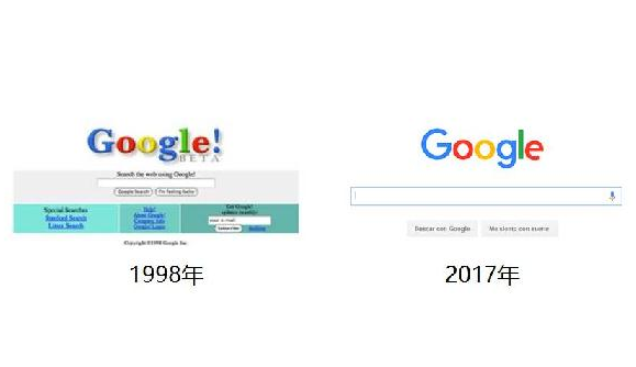 最重要的例子是 Google。Google 1998 年頁(yè)面長(zhǎng)這樣,2017 年頁(yè)面長(zhǎng)這樣,由消費(fèi)者加入的入口越來(lái)越簡(jiǎn)單,Google 越來(lái)越聰明。